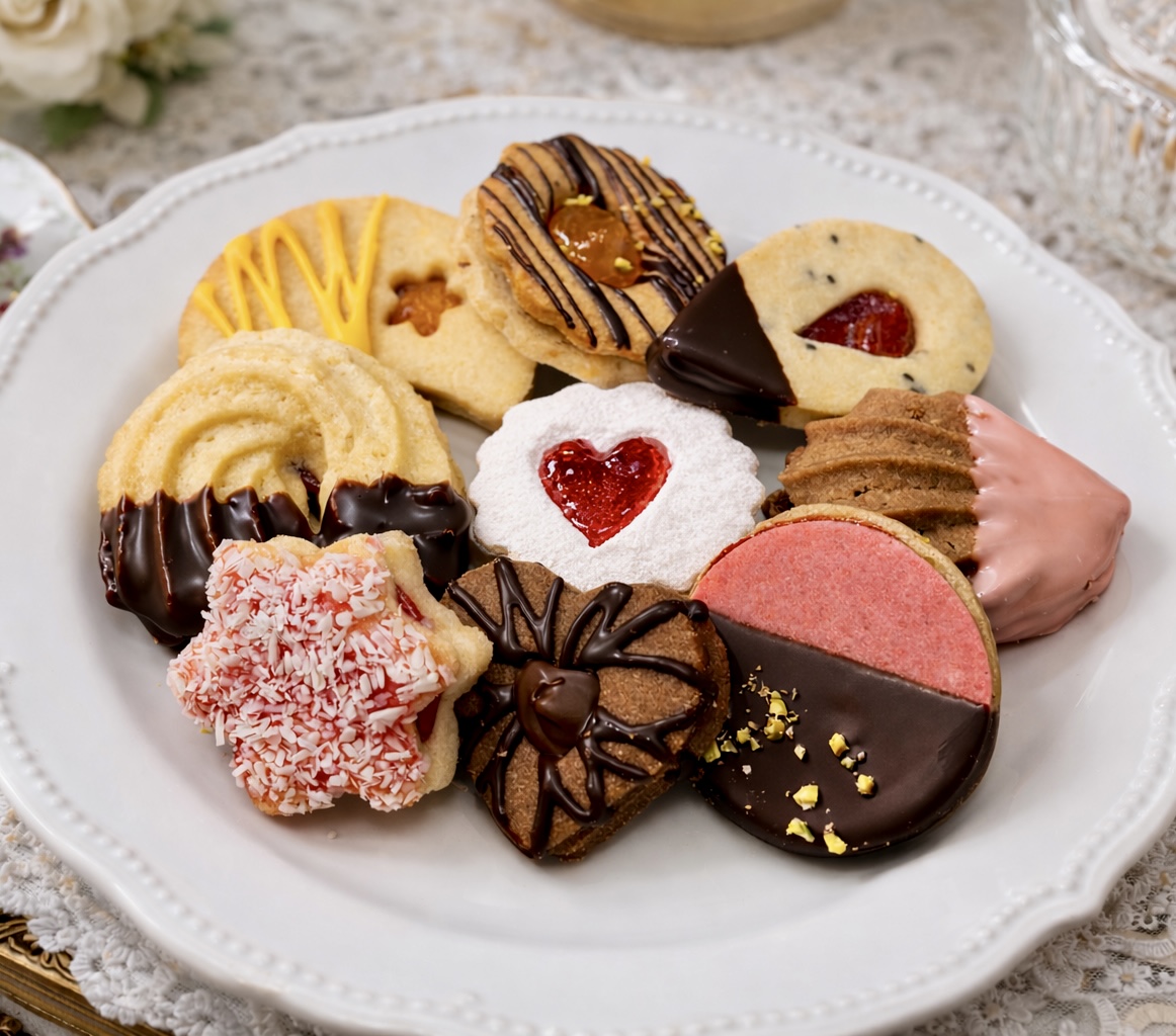 Zucker, Vanille, Zitrone, Backpulver, Pistazien, Kakao, Margarine (Raps- SonnenblumenFett, Wasser, Salz, Emulgator, Aroma, Säuerungsmittel: Citronensäure, Konservierungsstoffe: Kaliumsorbat), Zuckerstreusel, Glasurmasse (Zucker, pflanzliche Fette (Palmkern, Kokos), fettarmer Kakao (20%), Emulgator (Lecithin (SOJA), Aroma); Marillen-, Erdbeer-, Himbeer-, Orangenmarmelade, Nutella (Zucker, HASELNÜSSE, MagerMILCHpulver, Kakao, Emulgator Lecithine (SOJA), Vanillin), Honig, Kaffee