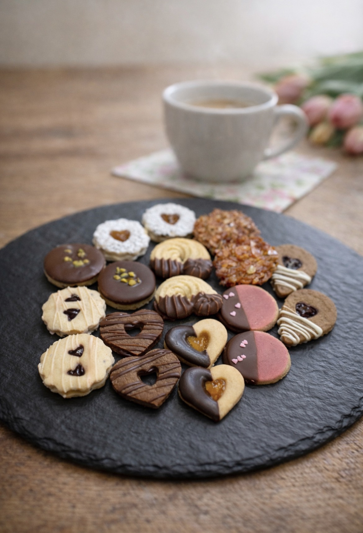 Eine kleine Auswahl an Kekse für den schnellen Genuss mit Linzerkipferl, Ischlertörtchen, Chiablüten, Florentiner, Kaffeetropfen, Linzerkipferl, Mandelscheiben, Nutelaherzen